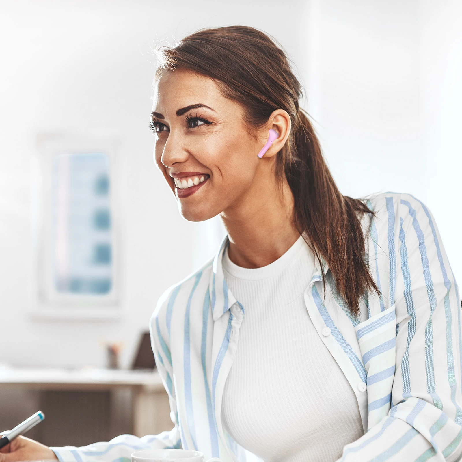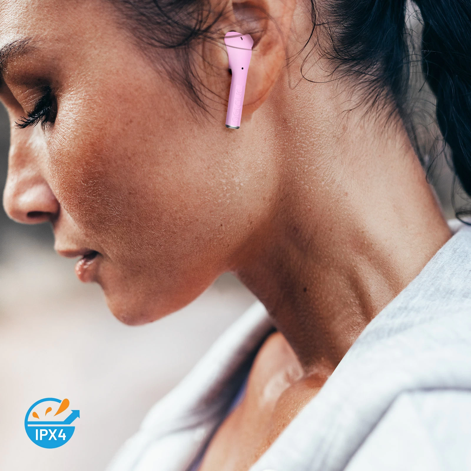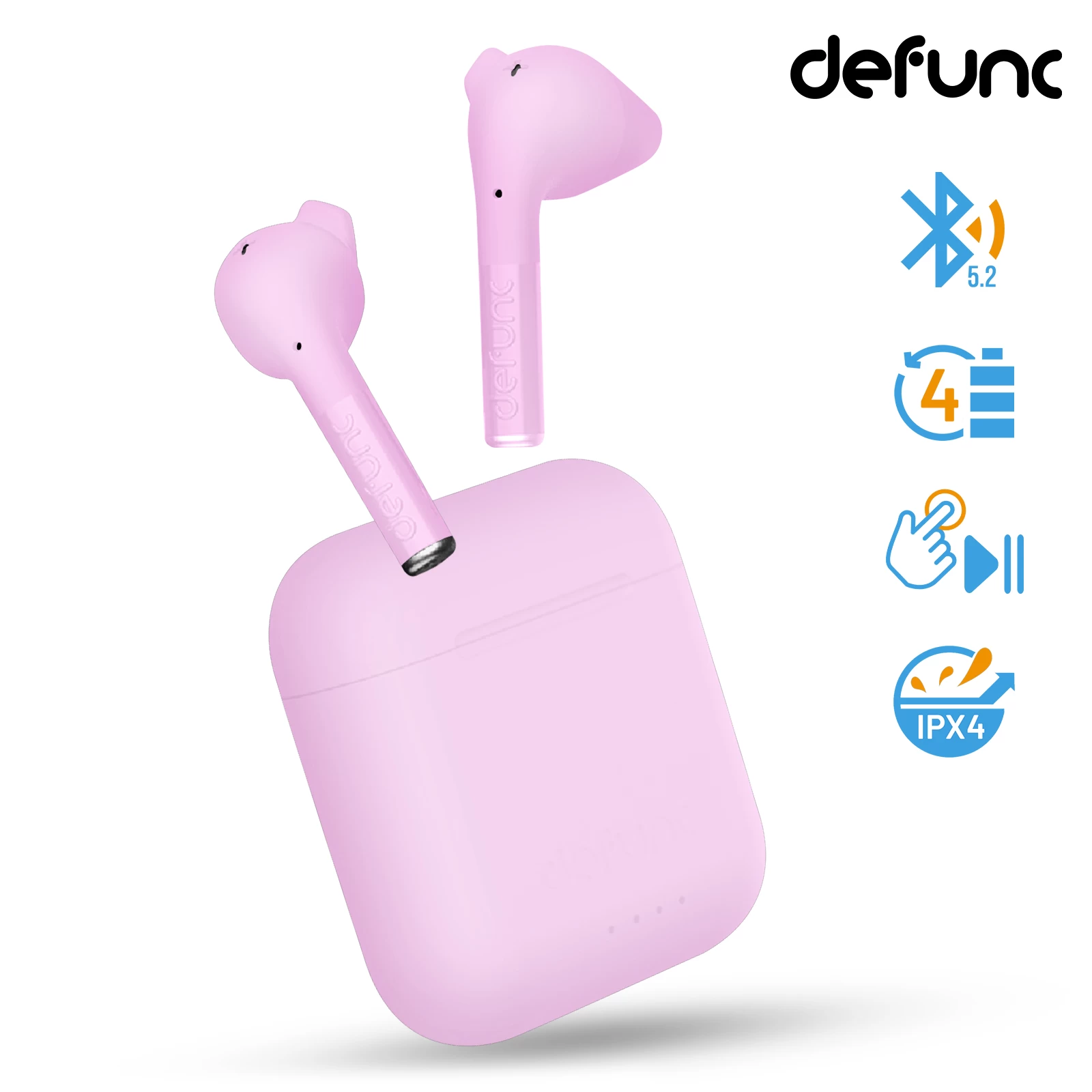 Ecouteurs sans fil Bluetooth rose Defunc pour passer des appels confortablement. Ils integrent un microphone de qualite et la technologie reduction de bruit pour un appel cristallin et sans bruits de fond. Commande tactile. Certifies IPX4.