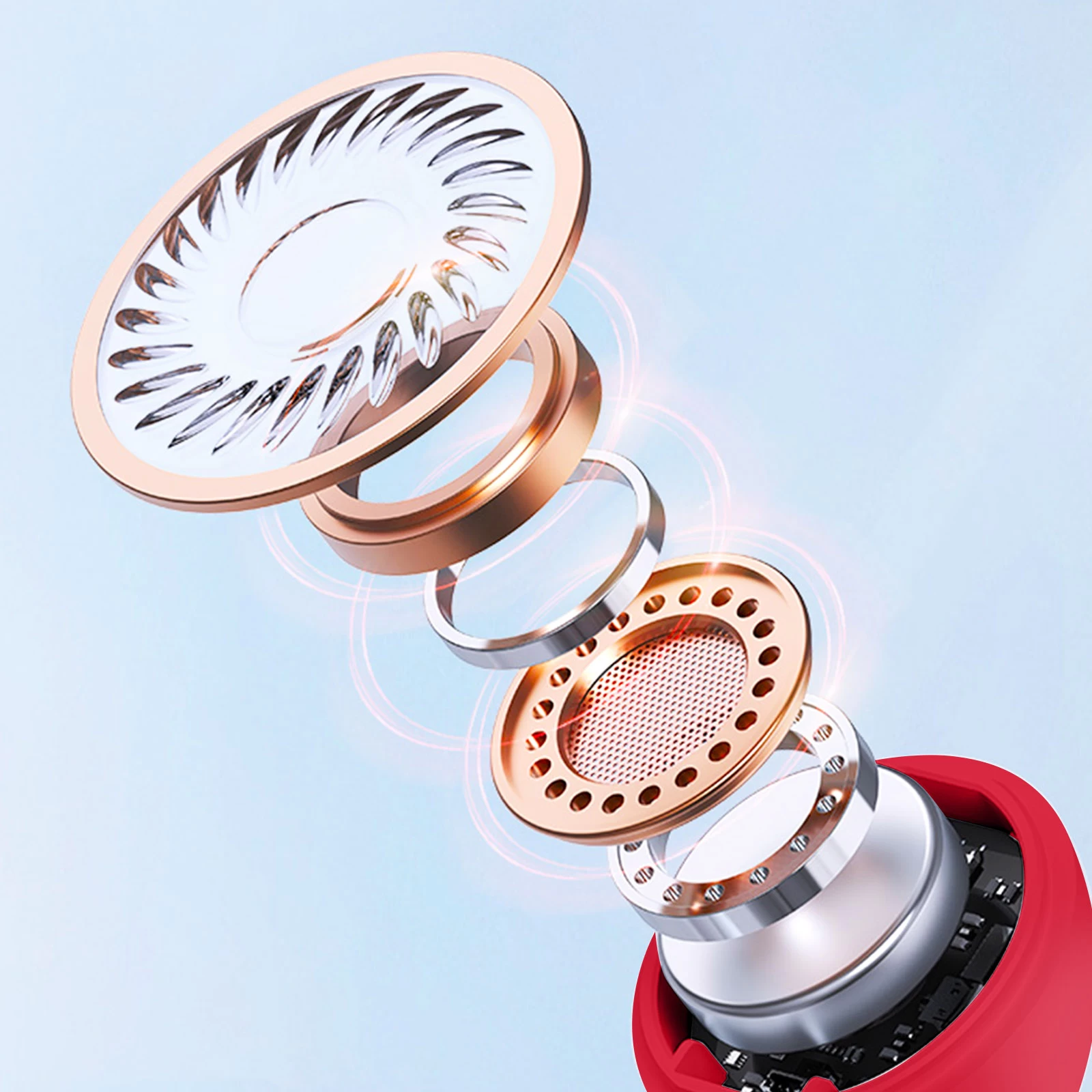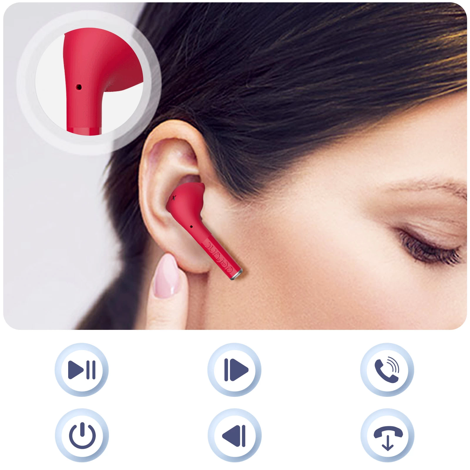 Ecouteurs sans fil Bluetooth rouge Defunc pour passer des appels confortablement. Ils integrent un microphone de qualite et la technologie reduction de bruit pour un appel cristallin et sans bruits de fond. Commande tactile. Certifies IPX4.