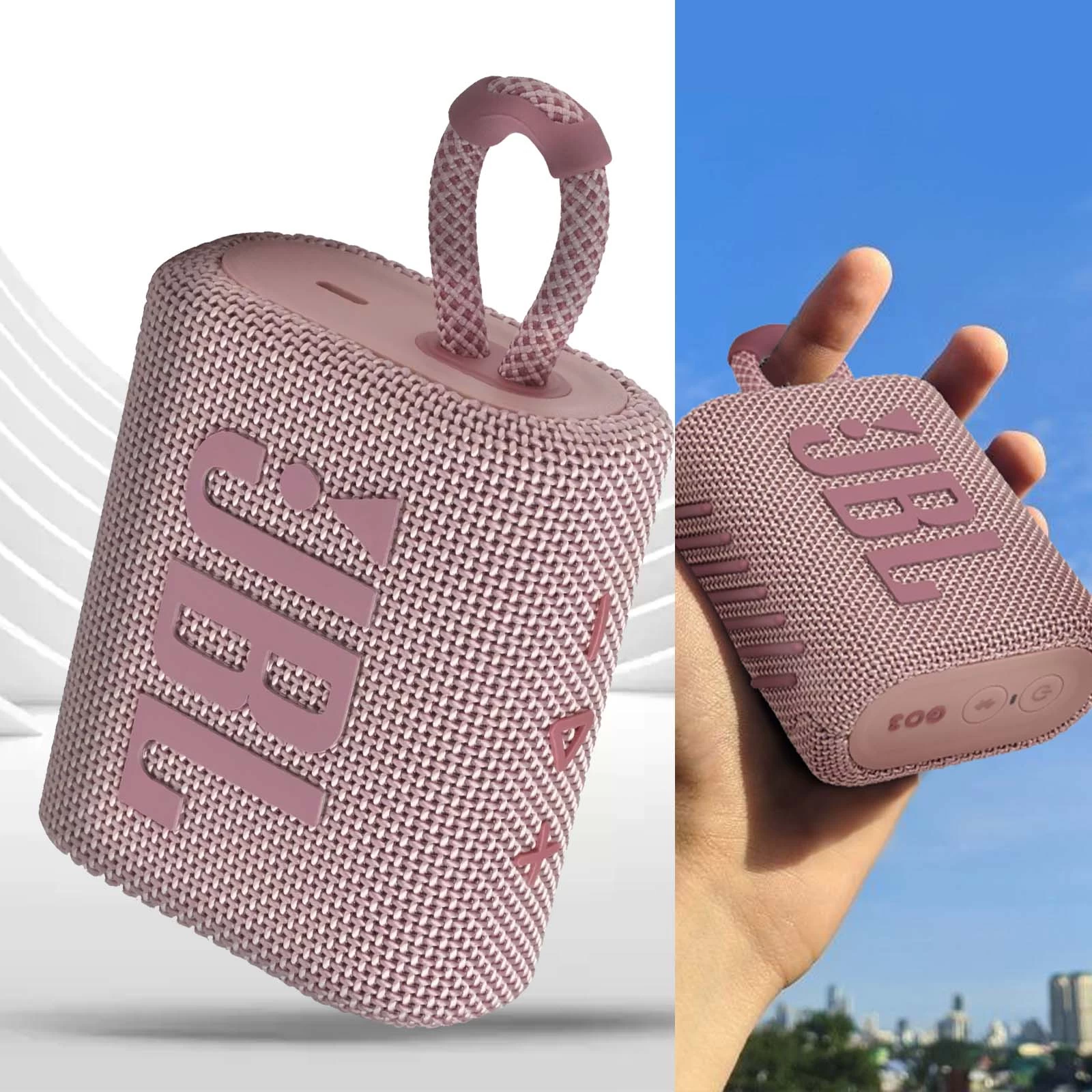 Portable et discrète avec des dimensions 8,6 x 6,9 x 4,0 cm et poids 209g, l’enceinte JBL Go 3 se place facilement dans une poche ou un sac pour toujours avoir une solution d’écoute disponible à chaque instant. Son design moderne au tissu coloré, sa boucle pratique et ses commandes intuitives faciliteront votre streaming audio lors de vos sorties, réunions entre amis ou vacances.