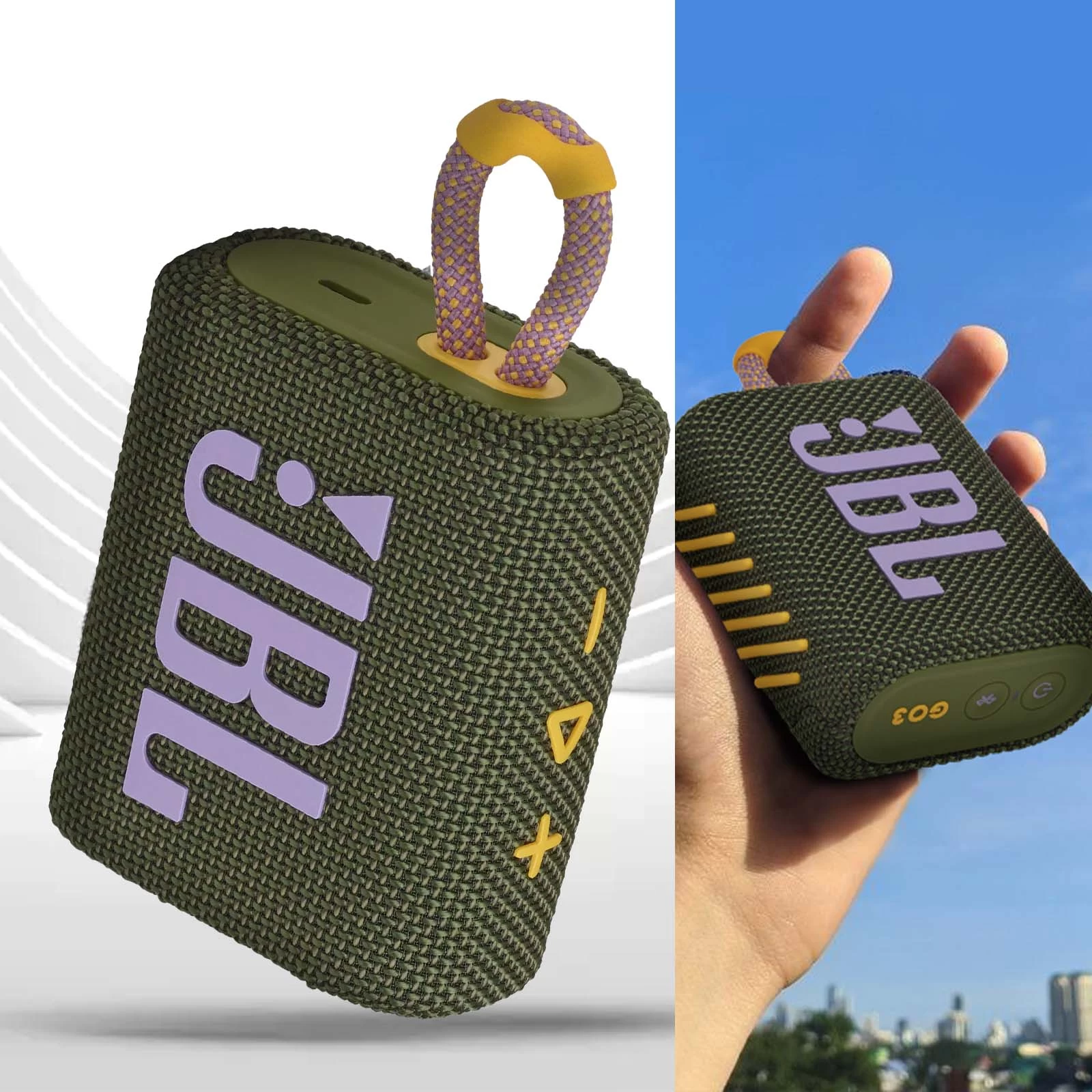 Portable et discrète avec des dimensions 8,6 x 6,9 x 4,0 cm et poids 209g, l’enceinte JBL Go 3 se place facilement dans une poche ou un sac pour toujours avoir une solution d’écoute disponible à chaque instant. Son design moderne au tissu coloré, sa boucle pratique et ses commandes intuitives faciliteront votre streaming audio lors de vos sorties, réunions entre amis ou vacances.