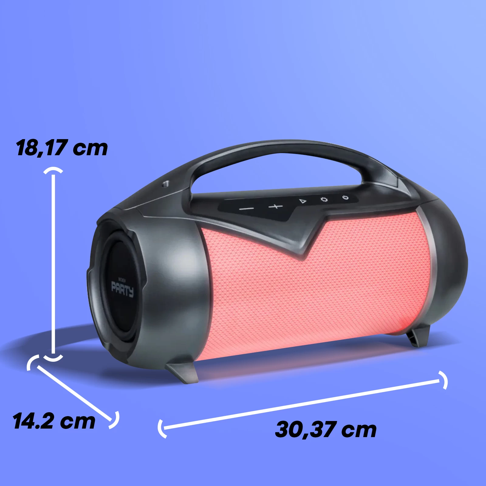 L’enceinte Party Lite vous accompagne partout grâce à son design cylindrique, sa légèreté et son format compact (30.37 x 18.17 x 14.2cm). De plus, une poignée est intégrée, permettant de la transporter sans effort.