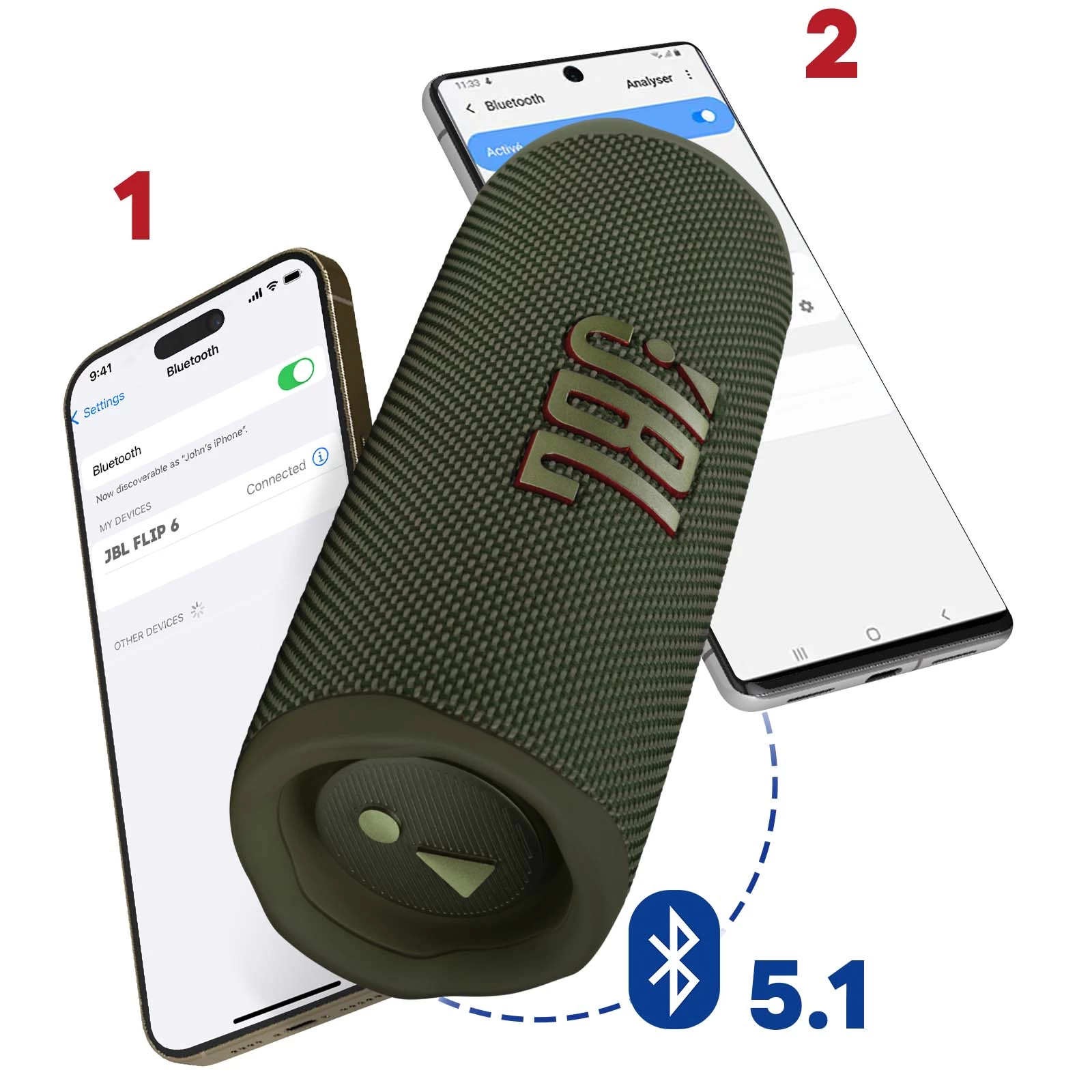 Associez jusqu’à deux appareils à votre JBL Flip 6 pour bénéficier du meilleur son audio JBL Pro. Passez d’un appareil à l’autre par simple pression de bouton. Connectez-les grâce au Bluetooth 5.1, qui vous offre une grande stabilité d’utilisation et une meilleure transmission sonore.